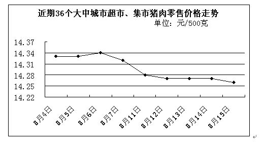 據國家發改委網站消息,國家發改委價格監測中心監測顯示,上周(8月11日-8月15日)全國36個大中城市超市、集市豬肉(精瘦肉)平均零售價格每500克為14.27元,比前一周(8月4日-8月8日,下同)下降0.42%。