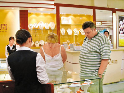 海南省從2011年元旦日開始率先試行離境退稅政策,包括香港人在內(nèi)的境外游客在指定商店購買退稅物品達(dá)800元人民幣,可以退回11%的稅。圖為外國游客在海南購物