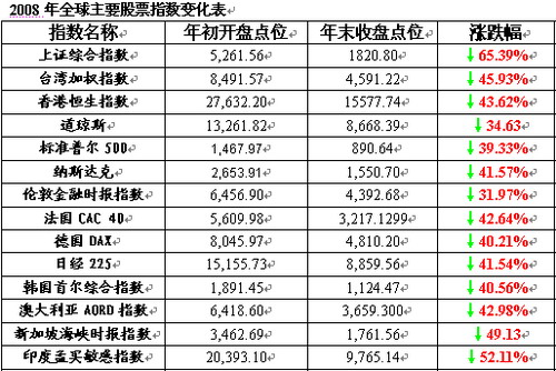 數據顯示,2008年,全球主要股票市場幾乎都是慘跌一片,美國三大股指數均出現超過40%的跌幅。其他工業國家股票市場走勢與美國基本一致。以下是全球主要股票指數年度漲跌幅: