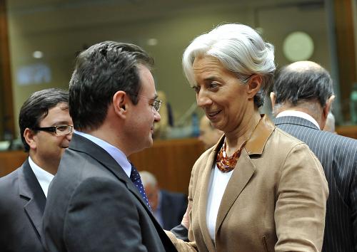 5月9日,在比利時(shí)首都布魯塞爾,法國(guó)經(jīng)濟(jì)、財(cái)政與就業(yè)部長(zhǎng)拉加德(右)與希臘財(cái)政部長(zhǎng)帕帕康斯坦季努在歐盟財(cái)政部長(zhǎng)特別會(huì)議舉行前交談。當(dāng)天,歐盟舉行財(cái)長(zhǎng)特別會(huì)議,討論捍衛(wèi)歐元穩(wěn)定、增強(qiáng)市場(chǎng)信心的具體實(shí)施方案。不斷升級(jí)的希臘債務(wù)危機(jī)和歐盟其他國(guó)家高額的公共債務(wù),使得市場(chǎng)對(duì)歐元區(qū)和歐元的前景普遍擔(dān)憂(yōu)。今年以來(lái),歐元兌美元匯率已經(jīng)下跌超過(guò)10%。歐盟機(jī)構(gòu)和歐元區(qū)國(guó)家領(lǐng)導(dǎo)人在7日特別峰會(huì)后表示將“不惜一切代價(jià)”捍衛(wèi)歐元和歐元區(qū)的穩(wěn)定。新華社記者武巍攝