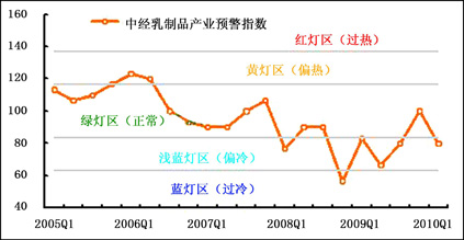 2010年一季度,中經乳制品產業景氣指數為98.1點(2005年增長水平=100),比上季度上升0.8點,比上年同期提高1.6點;中經乳制品產業預警指數為80.0點,比上季度下降20點,處于“淺藍燈區”內運行。