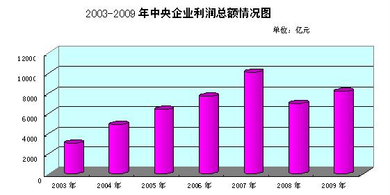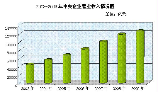 二、經營規模情況。截至2009年底,中央企業資產總額210580.8億元,比上年增長19.5%;凈資產總額83968.9億元,比上年增長14.6%。2009年中央企業實現營業總收入126271.6億元,比上年增長6.4%。在全部中央企業中,2009年底資產總額超過千億元的企業有53家,比上年增加8家;2009年實現營業總收入超過千億元的企業有38家,比上年增加5家。在美國《財富》雜志2010年公布的世界500強企業中,上榜的中央企業有30家,比上年增加6家,比2003年增加24家。