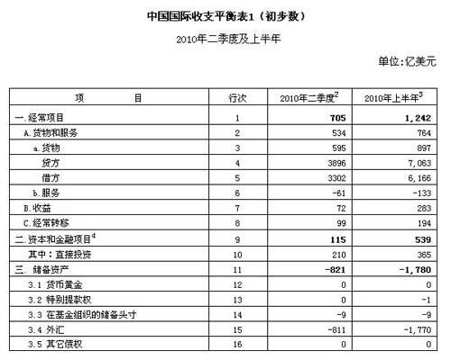 據介紹,2010年上半年,我國國際收支經常項目順差1242億美元,同比下降8%,經常項目順差占GDP的4.9%,同比下降1.3個百分點;資本和金融項目順差539億美元(含凈誤差與遺漏);國際儲備資產增加1780億美元,同比增長8%。