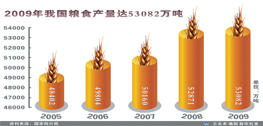 2004年以來,中國糧食連續(xù)6年增產(chǎn),去年糧食總產(chǎn)量達到10616億斤,比2003年增產(chǎn)2002億斤,糧食自給率保持在95%以上。