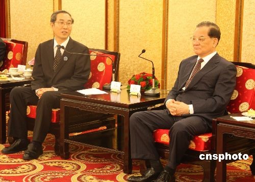 廣西壯族自治區(qū)主席馬飚五月二十一日率領(lǐng)廣西經(jīng)貿(mào)文化代表團乘坐包機飛抵臺灣,他是大陸第一個率團赴臺進行經(jīng)貿(mào)文化交流的正省級官員,此行是海峽兩岸交流史上的新突破。國民黨榮譽主席連戰(zhàn)(右)在臺北圓山飯店會見馬飚(左)主席一行。 中新社發(fā) 耿軍 攝