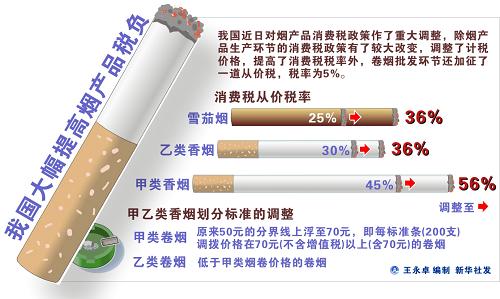 “為了適當(dāng)增加財政收入,完善煙產(chǎn)品消費稅”,近日,經(jīng)國務(wù)院批準(zhǔn),財政部、國家稅務(wù)總局對煙產(chǎn)品消費稅政策作了重大調(diào)整,除煙產(chǎn)品生產(chǎn)環(huán)節(jié)的消費稅政策有了較大改變,提高了消費稅稅率外,卷煙批發(fā)環(huán)節(jié)還加征了一道從價稅,新政策從5月1日起執(zhí)行。