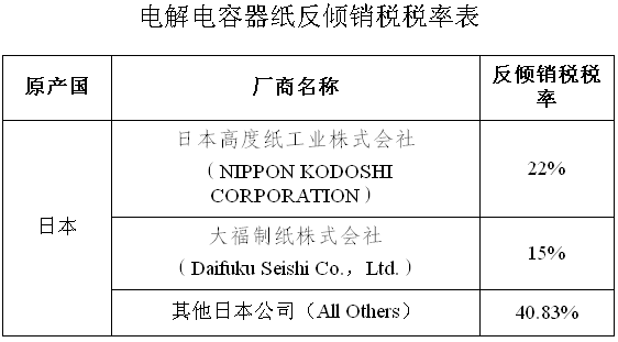 附件:電解電容器紙反傾銷稅稅率表