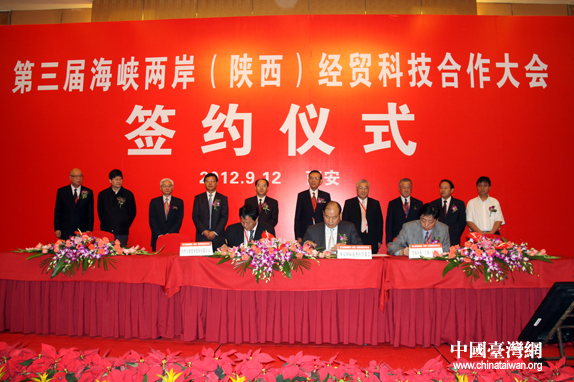 中國臺灣網(wǎng)9月12日西安消息 第三屆海峽兩岸經(jīng)貿(mào)科技合作大會(huì)12日上午在陜西省西安市隆重召開。兩岸560多位嘉賓匯聚一堂,共商陜臺兩地經(jīng)貿(mào)科技合作大計(jì)。在會(huì)議現(xiàn)場,來自陜臺兩地的幾十家企業(yè)一共簽署了十個(gè)項(xiàng)目的投資合作協(xié)議,總簽約金額超30億人民幣。