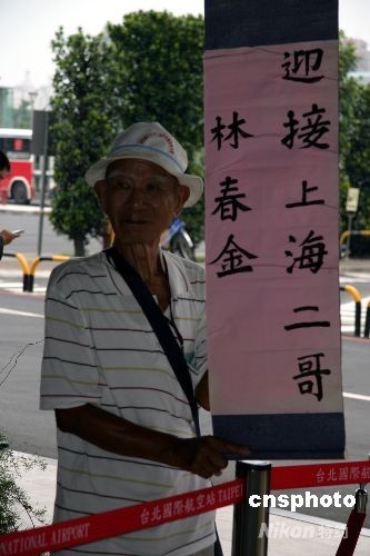 兩岸周末包機七月四日啟程,臺灣社會各界關注。二十歲來到臺灣的老伯林振鳳一大早從臺南趕到臺北松山機場,接搭乘兩岸周末包機八十四歲的二哥林春金。這將是林振鳳老人自十六年前臺灣當局開放到大陸探親后,他再次與兄弟相見。 中新社發(fā) 徐長安 攝