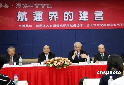 10月30日下午,臺灣海空航運業(yè)界代表由臺灣海峽兩岸航運協(xié)會常務(wù)顧問、長榮集團(tuán)首席副總裁林省三牽頭,與臺灣領(lǐng)導(dǎo)人馬英九見面并遞交陳情書,希望即將在臺北登場的陳云林與海基會董事長江丙坤會談能排除萬難,實現(xiàn)海空直航,促進(jìn)兩岸經(jīng)貿(mào)發(fā)展,造福于民。隨后,他們在臺北舉行記者會,表示非常歡迎海協(xié)會會長陳云林訪臺,并期盼兩岸直航早日落實。 中新社發(fā) 黃少華 攝