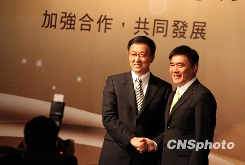 4月6日下午,“上海-臺北城市論壇”在臺北市晶華酒店登場,上海市長韓正、臺北市長郝龍斌分別發表演講。圖為兩人在演講結束后握手致意。 中新社發 董會峰 攝
