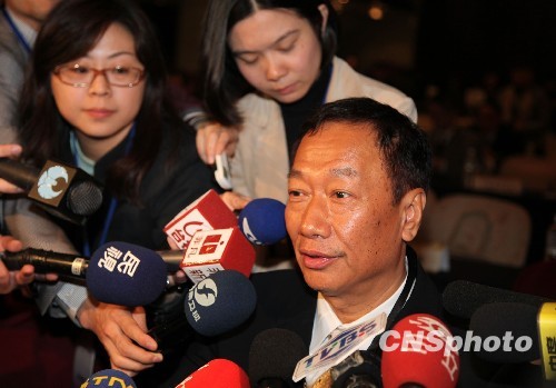 4月6日下午,臺灣鴻海集團董事長郭臺銘在出席上海-臺北城市論壇時向記者表示,雙城交流更具務實意義,他提出上海虹橋機場與臺北松山機場趕緊直飛、經濟互相取長、借重上海世博等3點希望。 中新社發 董會峰 攝