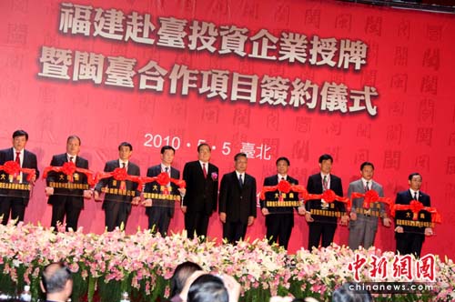 5月5日下午,“福建赴臺投資企業授牌暨閩臺合作項目簽約儀式”在臺北舉行,福建省長黃小晶、中國國民黨副主席曾永權為8家已獲兩岸行政部門核準的企業授牌,兩地企業代表還就數十個合作項目簽約。