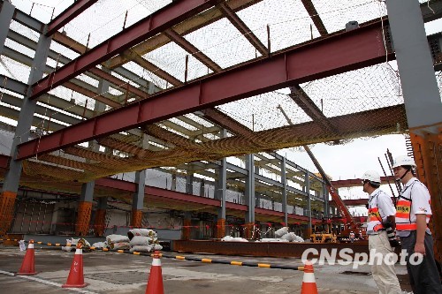 臺北松山機場定位“小而美”,正在加緊進行相關調整和建設,以趕及6月14日與上海虹橋機場對飛、10月與日本羽田機場對飛。圖為5月30日,馬英九所視察的建設中的松山機場貨運站。 中新社發 董會峰 攝