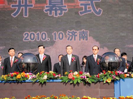 “2010年山東臺灣名品博覽會”昨日在山東濟南展開,山東省委書記姜異康(左二)和臺灣外貿(mào)協(xié)會董事長王志剛(右三)共同出席開幕典禮。圖片來源:臺灣中國時報