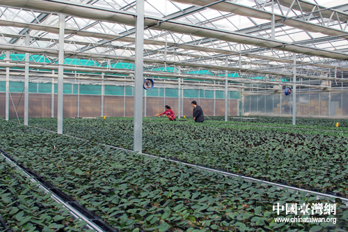 兩岸溫泉產(chǎn)業(yè)合作區(qū)的臺資展逸蘭花廠棚里,工人們正細心照料著蘭花幼株。(中國臺灣網(wǎng) 楊麗 攝)
