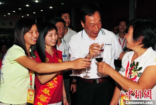 10月16日中午,富士康科技集團總裁郭臺銘在深圳宴請140名優秀基層員工家屬,并邀優秀基層員工于寧寧(左二)的雙胞胎妹妹加入富士康工作。 中新社發 陳文 攝