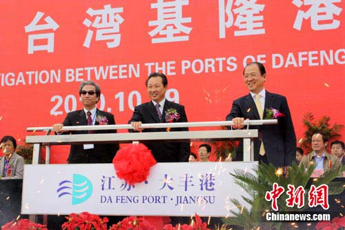 19日上午11時(shí)18分,隨著中共鹽城市委書記趙鵬一聲宣布,鹽城地方政府官員與臺(tái)灣基隆港物流協(xié)會(huì)會(huì)長(zhǎng)共同啟動(dòng)拉桿,一艘“寶宏8號(hào)”貨輪緩緩離岸駛向臺(tái)灣基隆港,江蘇大豐港與臺(tái)灣基隆港實(shí)現(xiàn)首次直航。