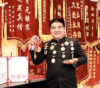 陳光標在辦公室展示歷年行善獲得的獎牌、徽章、證書等。圖片來源:臺灣聯合報