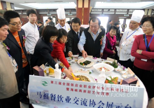 3月18日,臺北中華美食交流協會執行長梁幼祥、馬祖餐飲交流協會總干事林中超等閩臺烹飪美食業界嘉賓在此間展出的馬祖餐飲交流協會展示臺前觀摩交流。