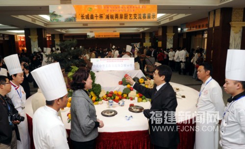 前來參加開幕式的臺北中華美食交流協會執行長梁幼祥在該協會展示臺前向福建烹飪、飯店業界人士介紹主題為“五彩繽紛兩岸情”的臺北美食展示。