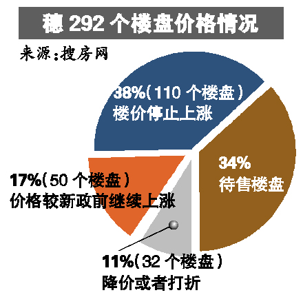 搜房網近日統計了全市292個樓盤,其中有50個樓盤價格較新政前繼續上漲,占比高達17%;樓價停止上漲的樓盤有110個,占比為38%;只有32個樓盤出現比較明顯的降價或者打折,占比為11%;另外34%為待售樓盤。而二手市場上,一些投資型業主開始拋售房源,但是降價幅度一般都在5%~10%左右。
