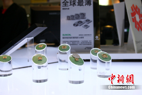 在“臺灣精品館”的精品中,一枚比一角硬幣還小的風扇引來眾多參觀者駐足!芭_灣精品館”相關負責人告訴記者,這枚全球最薄的微型風扇是臺灣建準科技研發制造,其厚度僅0.3公分,是全球已量產風扇中最薄的微型風扇,被廣泛應用在新一代平板計算機和手機內,其使用極微的電力,即可產生良好的散熱效果。