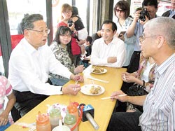 福建省長(zhǎng)黃小晶(左一)在臺(tái)南市安平街區(qū)一家知名蝦卷店,邀請(qǐng)臺(tái)灣民眾一起享用美味的點(diǎn)心。圖片來源:臺(tái)灣《中國時(shí)報(bào)》
