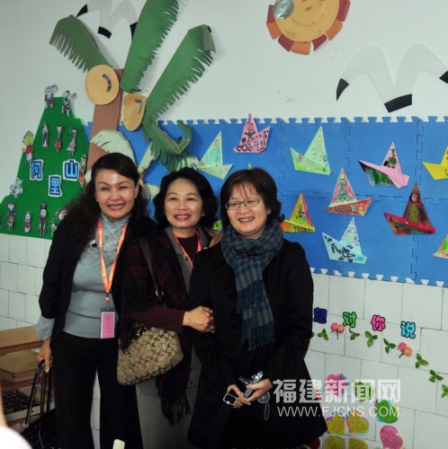 11月15日,臺灣多所高校和研究機構的知名專家、學者等參訪福建兒童發展職業學院附屬幼兒園,并開心的在孩子們手工作品前留影。期間,海峽兩岸學前教育研討會在福建舉行。(張麗君 攝)
