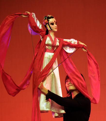 11月15日,上海市木偶劇團演員在表演杖頭木偶《歡慶紅綢》。當日,為期3天的首屆海峽兩岸木偶藝術節在福建漳州開幕,來自臺灣、上海、湖南、福建泉州、漳州的8個木偶劇團同臺獻藝,為觀眾奉獻了精彩的演出。木偶戲是一種古老的民間藝術,漢朝時期就在民間出現,唐宋時進入全盛時期。2006年漳州市木偶劇團的布袋木偶戲和木偶頭雕刻被列入首批國家非物質文化遺產保護名錄。新華社記者 沈汝發 攝