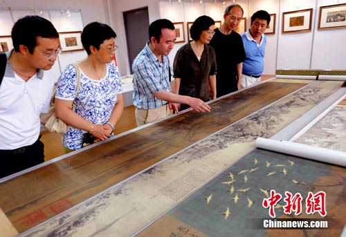7月8日,觀眾在福州舉辦的“兩岸故宮高仿真宮廷畫聯(lián)展”上被展出的一幅合璧版仿真《富春山居圖》所深深吸引。《富春山居圖》是元朝畫家黃公望的代表作,是其為無用師和尚所繪,以浙江富春江為背景,全圖用墨淡雅,山和水的布置疏密得當(dāng),墨色濃淡干濕并用,極富變化,被譽為中國十大傳世名畫之一,其流傳經(jīng)歷充滿傳奇色彩,目前兩岸各存一段。據(jù)了解,此次“兩岸故宮高仿真宮廷畫聯(lián)展”共展出130余件高仿真作品,囊括了隋唐五代、宋、元、明、清和近代各個時期書畫名家的傳世佳作。