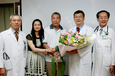 福建泉州男子施純炳(中)因罹患心臟疾病,在臺(tái)南奇美醫(yī)院進(jìn)行手術(shù),成為臺(tái)南地區(qū)首例赴臺(tái)就醫(yī)的大陸人士。2日他與女兒(左2)一起向主治醫(yī)師致謝。圖片來源:臺(tái)灣“中央社”