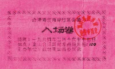 我喜歡收藏各種類型的門券,在收藏的形形色色門券中,有一張最為特別、簡單和罕見。這就是27年前,也就是1984年元宵節福建省東山島舉行的臺灣海峽兩岸燈謎會猜入場券?吹竭@張粉紅色的特殊入場券,我的記憶又回到當年氣氛熱烈的燈謎猜射場景中。