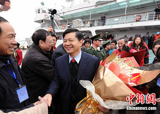2月16日,農歷正月十四下午,出席第九屆“兩馬同春鬧元宵”系列活動的馬祖縣長楊綏生、馬祖知名人士曹爾忠一行,乘坐“臺馬輪”經“兩馬”航線抵達福州港馬尾客運站,受到當地熱烈歡迎。