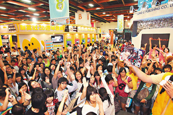 2日是漫畫博覽會最后一天,依慣例都有各式大甩賣,漫迷一早就在場外排得老遠,雖然人次不若前幾天,買氣仍然暢旺,各攤位、走道滿滿都是人。