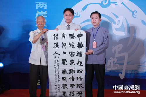 臺灣嘉賓團團長焦仁和將題有“中華雄起四海欽,泱泱風(fēng)雅客來頻。情系神州千千處,遍開馨果蔭后人”詩句的書法作品,贈與中華文化聯(lián)誼會副秘書長肖夏勇。(中國臺灣網(wǎng) 趙輝 攝)