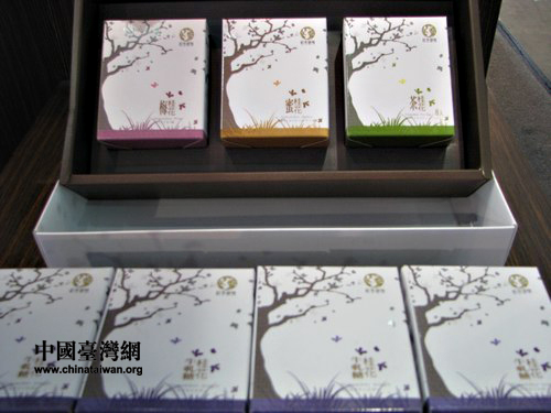 臺中市東勢區大茅埔社區帶來了眾多桂花相關產品,圖為包裝精致的多種類桂花糖。(中國臺灣網 馬迪 攝)