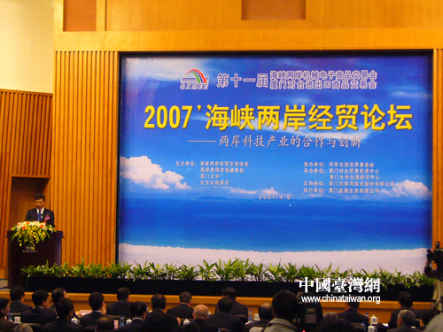 中國臺灣網4月8日廈門報道   2007海峽兩岸經貿論壇于今天上午在廈門國際會展中心隆重召開。此次論壇主要圍繞兩岸科技產業的合作與創新這個主體展開。商務部崇泉部長助理在會上發言,并宣布大陸即將出臺一項促進對臺小額貿易發展的政策。