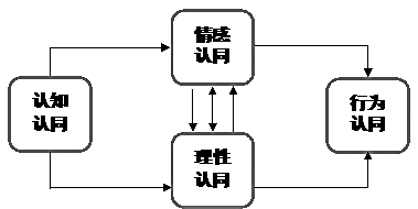 大學生對社會主義核心價值觀的認同沿著認知認同——情感認同——理性認同——行為認同遞進式發展,是一個從感性到理性、從內在情感到外在實踐反復進行的過程。認知認同是基礎,情感認同是催化劑,理性認同是關鍵環節,行為認同是歸宿。認知認同可促進形成情感認同和理性認同,情感認同和理性認同會互相強化,進而通過行為認同得以體現。