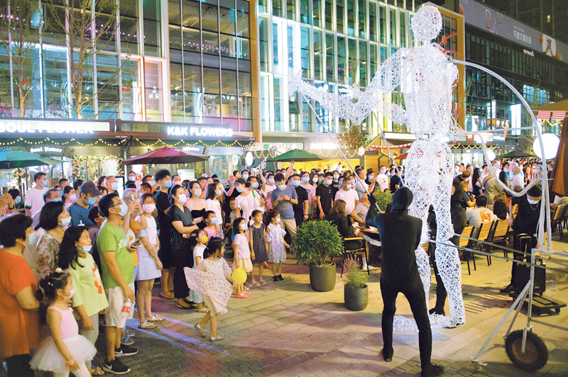 2020年8月8日,北京市朝陽區的“潮朝陽”消費季活動正式重啟。圖為8日當晚,市民在望京小街商業街觀看巨型人偶表演。 新華社記者 陳鐘昊/攝