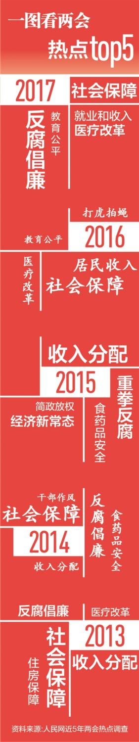 黨的十八大以來,以習近平同志為核心的黨中央強力推進黨風廉政建設和反腐敗斗爭,取得顯著成效,獲得社會各界一致肯定,受到方方面面持續關注。縱向看,在2013年以來人民網歷年兩會熱點調查中,“反腐倡廉”話題一直穩居前五位;橫向看,今年的兩會熱點調查中,“反腐倡廉”也進入新華網等兩會熱點調查榜單前五位。