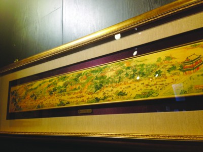“創意臺灣”是本屆博覽會的亮點,記者昨在一家企業展廳中看到,掛在墻體的都是黃金底色的彩畫,上面的圖案多為名作或出自名人之手!拔覀冞@叫黃金油畫,是臺北國立故宮博物院獨家授權,并和歷史博物館和臺北市立美術館合作的,畫作全部來自他們。”展區負責人介紹,畫作的底材是24K金,通過熱烘壓制而成,“就像一張黃金紙,然后在其上用特殊的顏料作畫!闭箯d內有郎世寧的《八駿圖》,也有清版的《清明上河圖》,前者售價18800元,后者則要29800元。