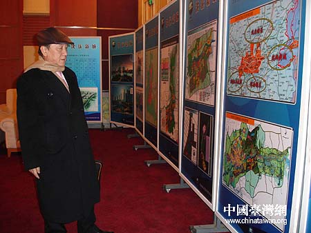 臺灣新黨主席郁慕明仔細觀看沈撫新城規劃。圖片來源:撫順市臺辦