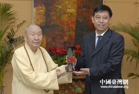 中國臺灣網5月7日西安消息 5月6日晚,陜西省臺辦主任閆超英在西安索菲特人民大廈會見臺灣中臺禪寺惟覺長老率領的赴陜參訪團一行。閆超英向惟覺長老贈送了代表陜西特色的禮品“華縣皮影”,惟覺長老回贈了中臺禪寺的“鎮寺之寶”辟邪半圓水晶模型。