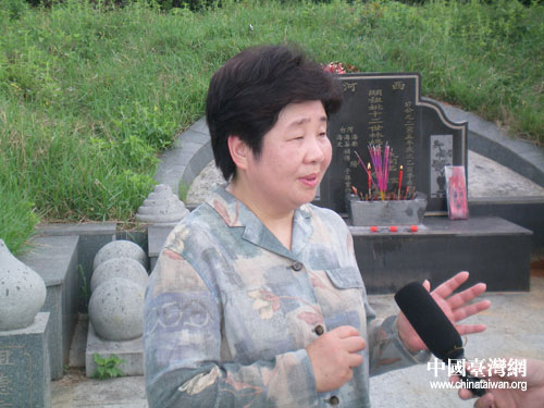 林明月在林媽宋氏祖墓前祭拜,并接受采訪。(漳浦縣臺辦陳文亮 攝)