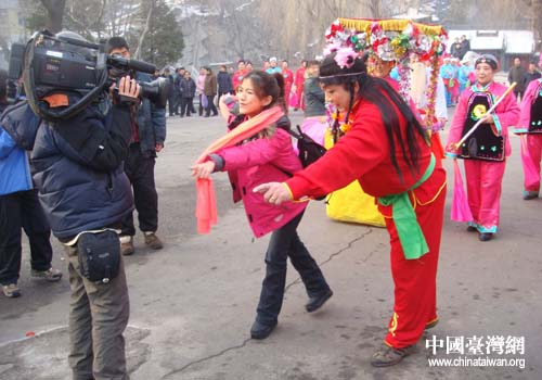 在本溪湖,臺灣記者們看到了本溪湖的非物資文化遺產(chǎn)《小推車》。看到當?shù)鼐用竦木饰璧副硌荩_灣中天電視臺主持人幃幃情不自禁地隨之起舞,并謙虛請教“小車舞”發(fā)明人,與之共舞。(中國臺灣網(wǎng)本溪市臺辦通訊員 孫秀國)