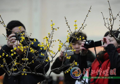 攝影愛好者在?迪灻饭澤吓臄z盆景蠟梅(資料圖片)