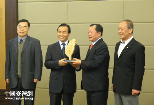 臺(tái)灣苗栗縣縣長劉政鴻率領(lǐng)的苗栗縣考察團(tuán)到牡丹江進(jìn)行考察訪問。雙方代表互贈(zèng)禮品,表達(dá)情誼,圖為苗栗贈(zèng)送的木雕(圖片來源:牡丹江市臺(tái)辦)