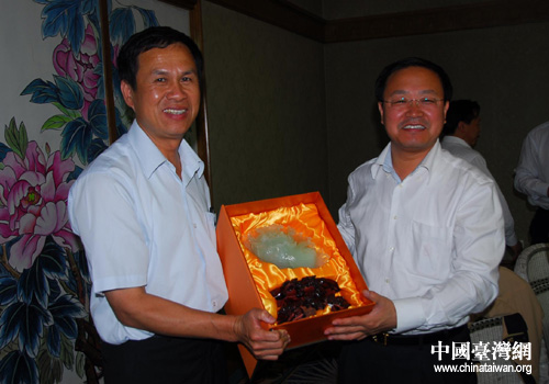 鞍山市副市長王忠哲向臺灣客人贈送禮品(圖片來源:鞍山市臺辦)
