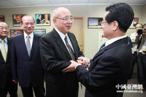 吳伯雄迎接浙江省委書(shū)記趙洪祝的到來(lái)。(浙江臺(tái)辦王健 攝)